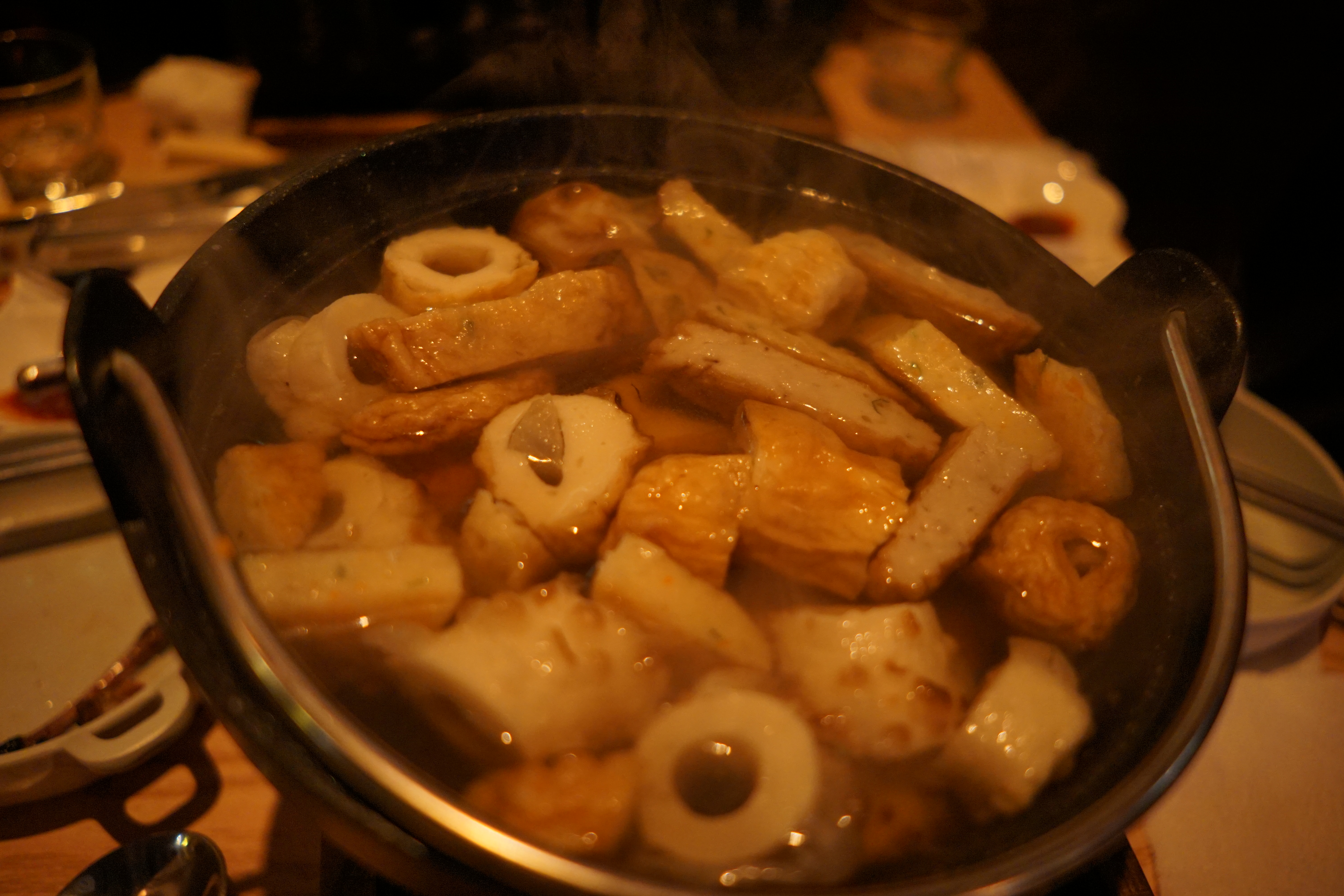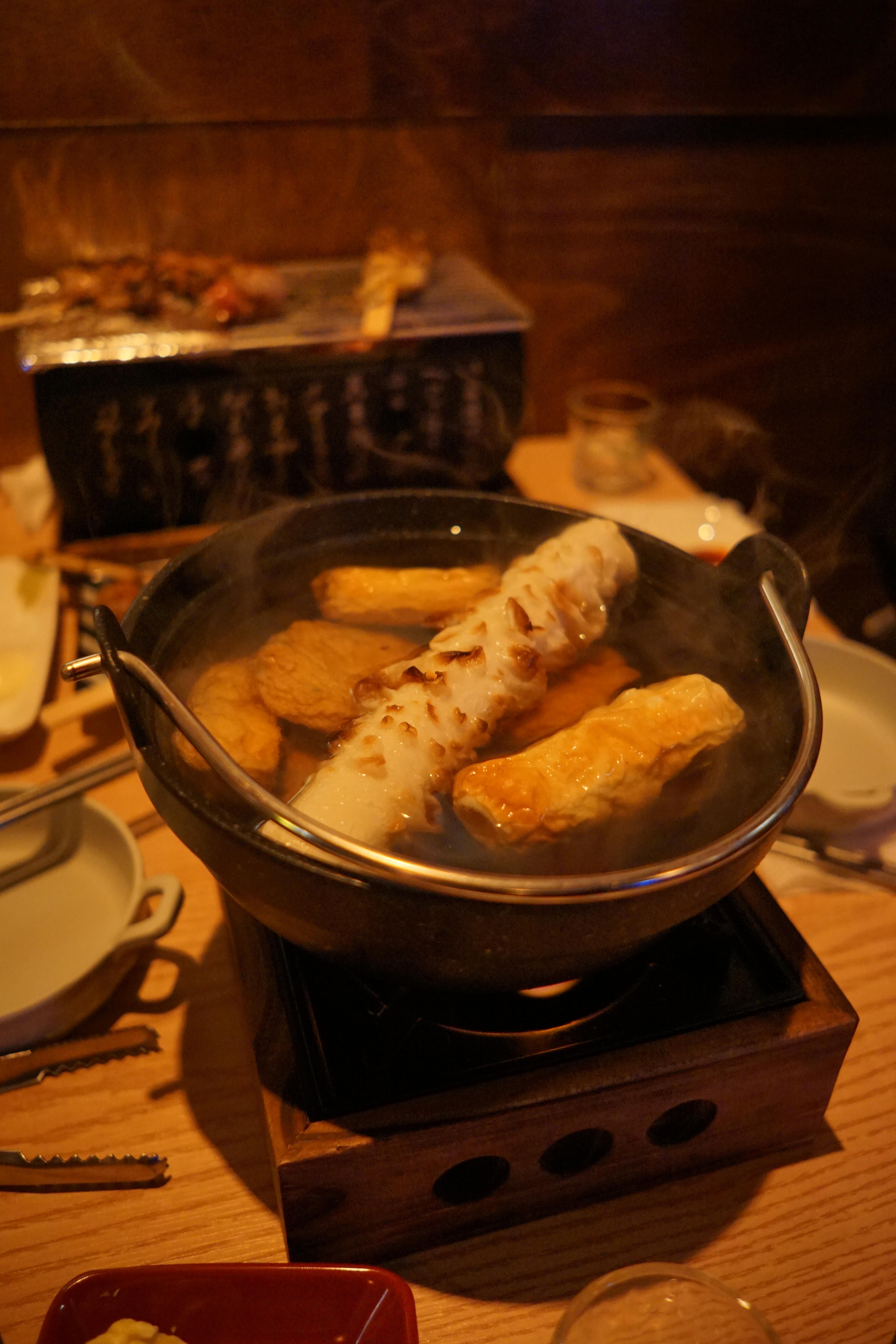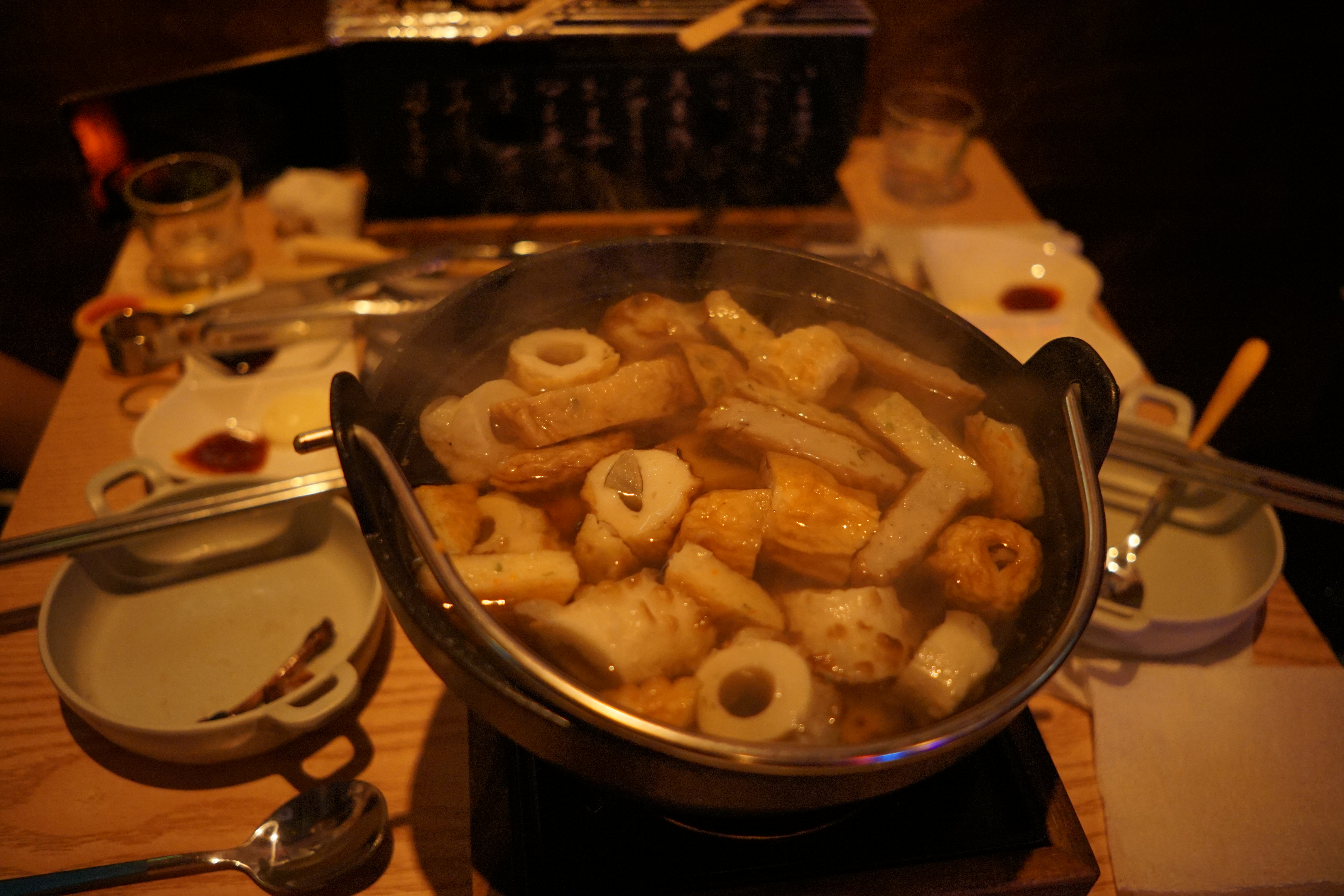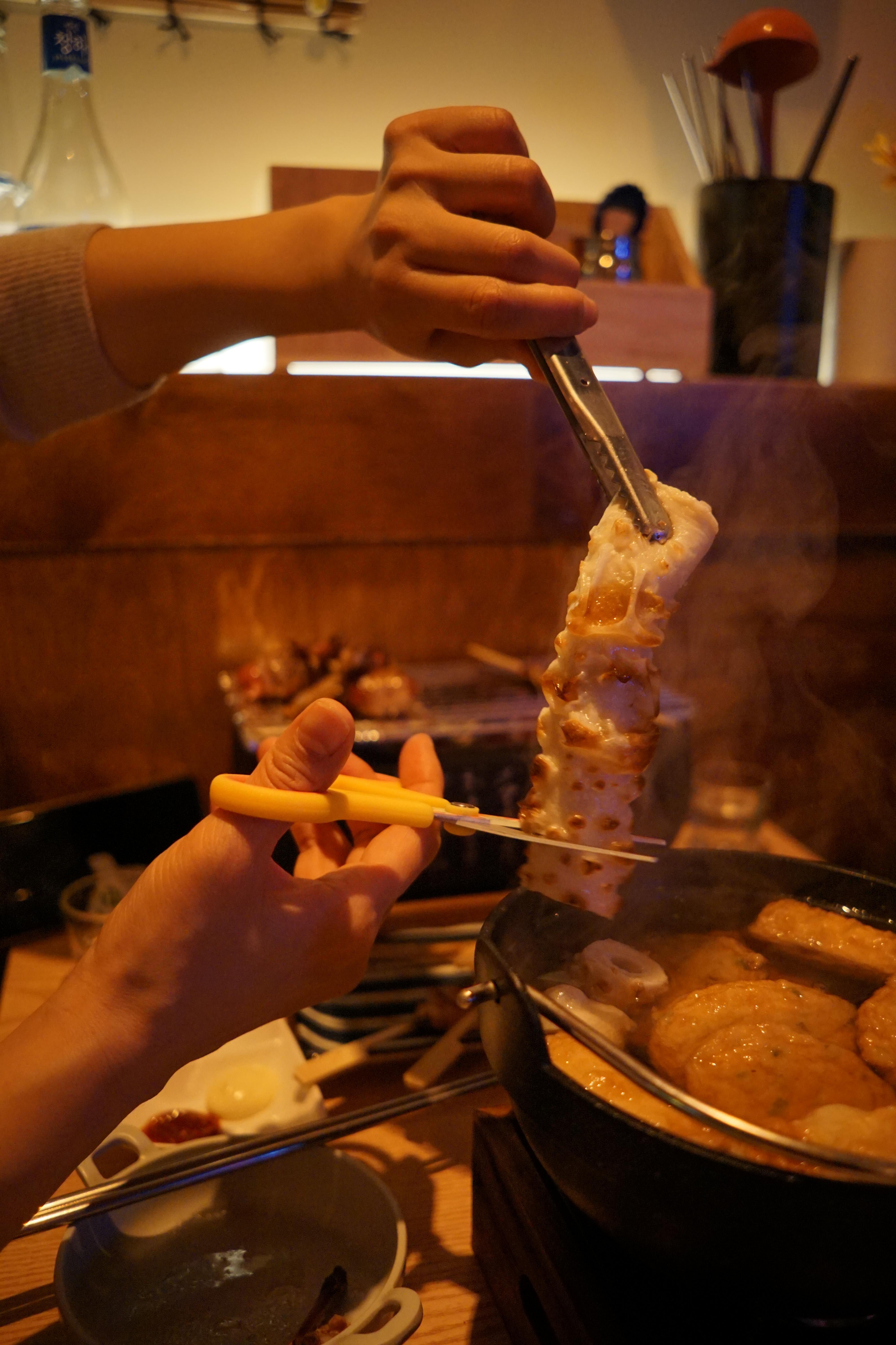 꼬치를 맛있게 먹고 있다 보면 따끈한 어묵탕도 나오는데, 어묵탕은 고체 연료를 써서 따듯하게 먹을 수 있게 해 주시더라고요!